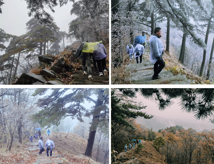 11月7日清晨天氣驟變,山間雨淅淅瀝瀝地下著,寒風凜冽,但這并沒能阻止我們一致攀爬大別山主峰白馬尖的決心。毅行中漫山松翠映入眼簾,層林浸染,穿插著的打卡任務,讓我們齊頭并進。當遇體力透支的同事時,大家相互攙扶鼓勵。登山過程中,團隊內部之間的溝通與協作,充分體現了群策群力的力量和團結的精神。